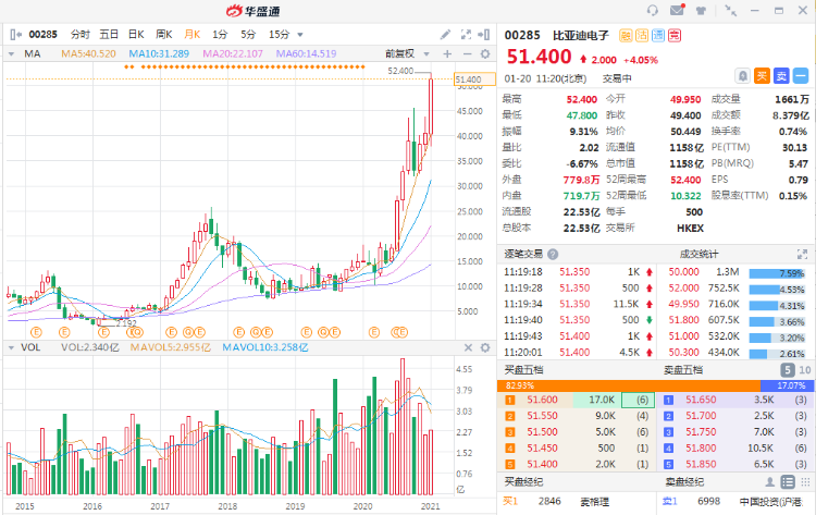 昨天,比亚迪电子股价进一步突破去年10月所创的纪录高位45.6港元,一度达到50.5港元,涨幅最高达到17%,全天成交额近24亿港元。公司今日开盘后,股价短线震荡上冲,早盘涨幅一度达到6%。