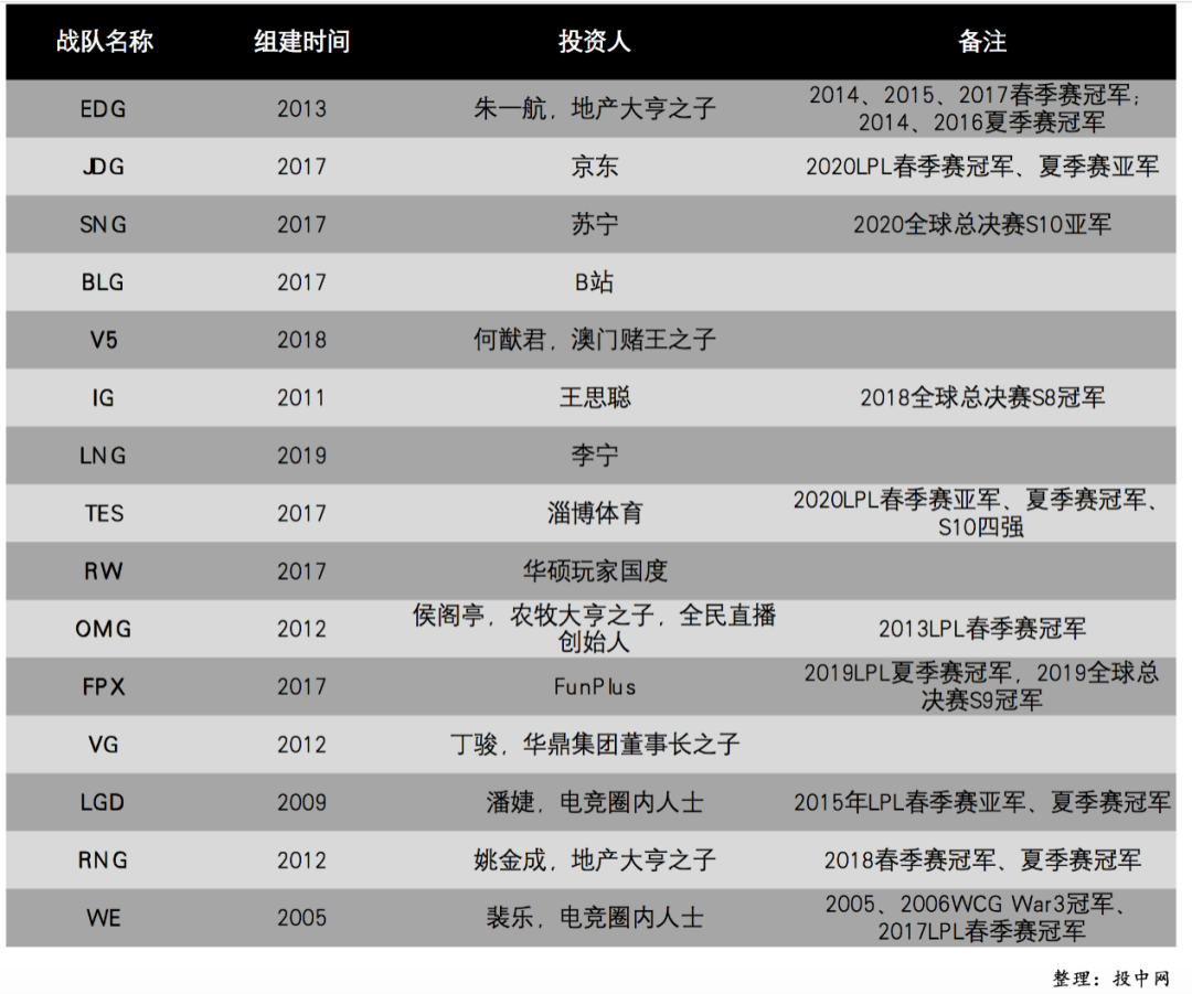 如上图所示,2017年京东、苏宁和手游独角兽FunPlus、体育用品零售巨头滔搏体育分别通过组建、收购的方式成立JDG、SNG、FPX、TES四只战队,这些巨头支持的战队很快击败一众老牌战队,在2019年和2020年统治了国内的LPL赛场,并在LOL全球总决赛S系列赛上也取得了不错的成绩。