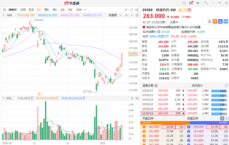 港股午后,阿里巴巴-SW (HK:9988)直线上涨,涨超7%。