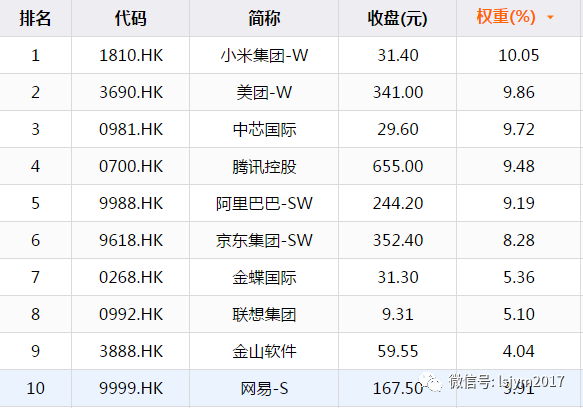 截至1月19日,该指数前十大权重股合计权重占比为74.99%,具体包括:小米集团、美团、中芯国际、腾讯控股、阿里巴巴和京东集团等。