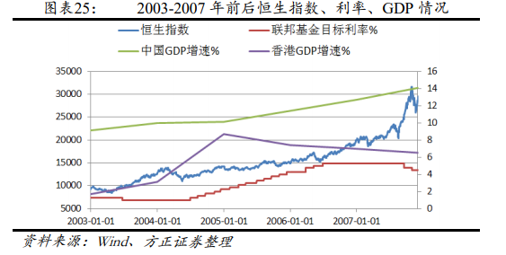 美联储从 2004 年 6 月开启了连续 17 次的加息周期,在 2006 年 6 月加至 5.25 的水平。标普指数从 2003 年下半年至 2007 年金融危机之间的 4 年时间涨幅 96%。这一时期以中国为代表的新兴市场国家经济增长强劲,中国和香港 GDP 年均增速分别超过 11%、7%。美元指数从 94.53 跌至 76.47,跌幅达 19.2%。原油期货价格从 28 美元上涨至 90 美元。