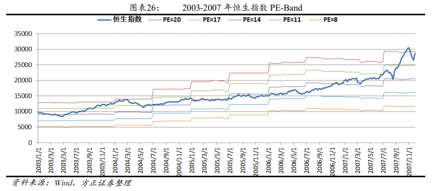 亚洲金融危机后风险溢价逐步回归正常,估值也回归到 12 倍左右的正常时水平。虽然美联储从 1999 年 7 月起 1 年内 6 加息,但在香港和全球经济增长的加速的背景下,港股仍然保持上涨,估值始终保持在 12 倍左右的正常水平,风险溢价也处在合理水平。