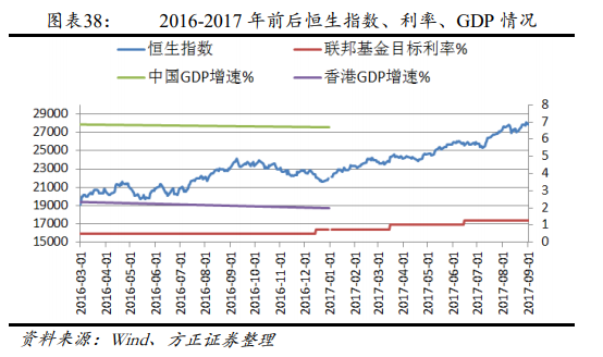 A 股股灾后港股逐步恢复,2016 年底深港通开通,南下资金日益增加。2017 年中国房地产行业景气度大幅回升,景气指数从 93 快速提升到 100 以上,带动港股地产、汽车等周期行业加速上涨。3 月开始上游原材料价格开始上涨,经济复苏的预期越来越强。同时美国经济稳步复苏态势向好,加息节奏稳健。2016 年低点至高点恒指涨幅高达63.68%。
