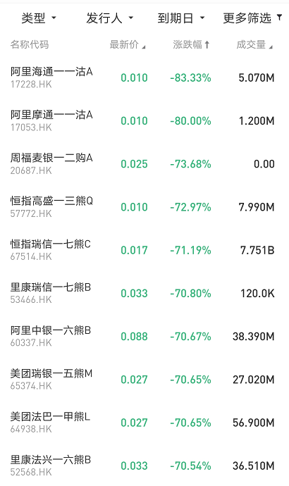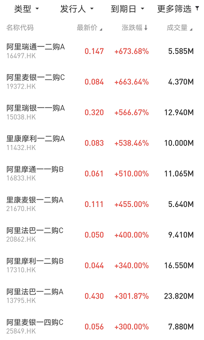 今日阿里大反弹,127只轮证涨幅在100%以上(含100%)。