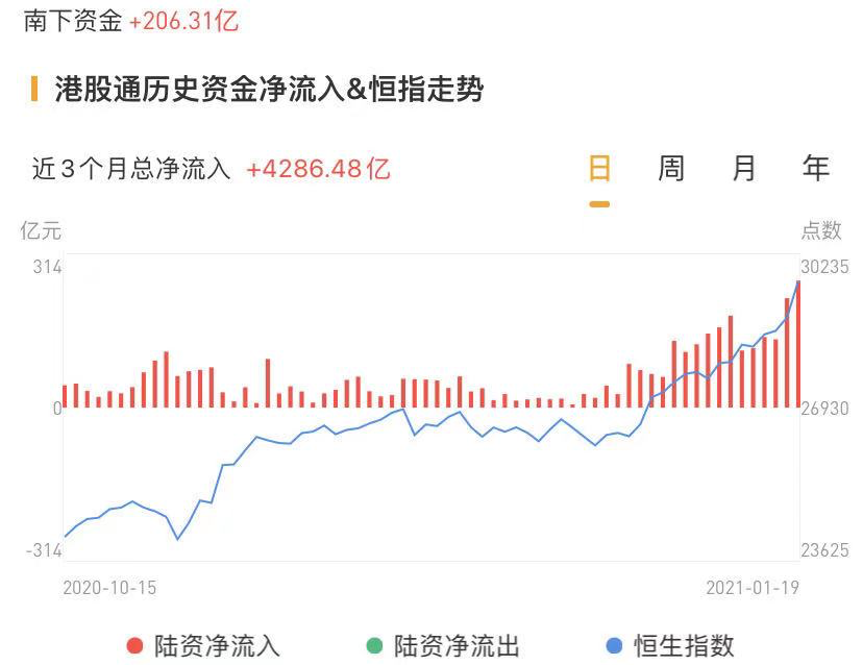 南下资金今日净流入港股高达206.31亿港元,流入规模有所减少,但仍在200亿港元水平线之上。
