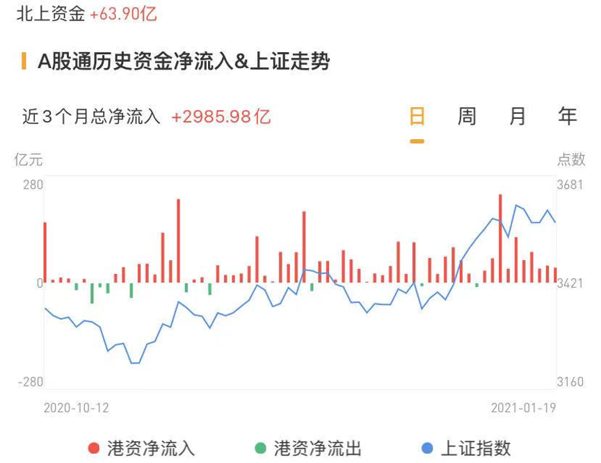 北上资金今日净流入63.90亿元,流入规模较前一交易日接近翻倍。