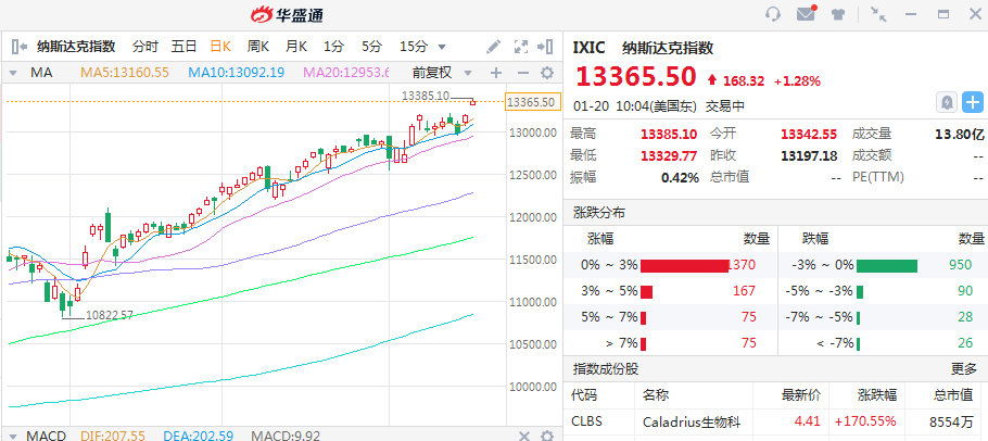华盛资讯1月20日消息,美股盘中,大型科技股普涨,标普、纳指齐创纪录新高,截至发稿,纳指大涨168.32点,涨幅1.28%,标普500指数涨0.85%。