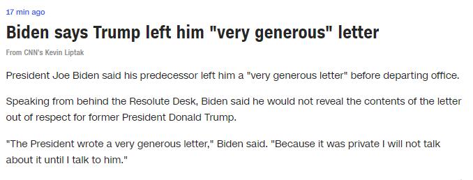 【环球网报道】美国有线电视新闻网(CNN)刚刚消息,当地时间1月20日,美国总统拜登说,特朗普给他留下了一封“非常大方”(very generous)的信。