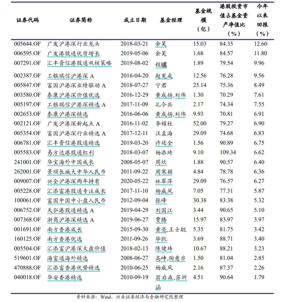 兴业证券整理了将主要仓位投资于港股市场的被动与主动基金。其中,筛选标准为最近一期港股投资市值占基金资产净值比例高于70%,且最新基金规模高于1亿。