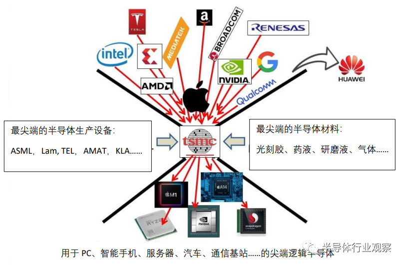 如上所述,TSMC走在全球尖端微缩化的最前沿,但其产能却严重不足。换句话说,苹果、高通、AMD、NVIDIA、博通、赛灵思(Xilinx)、联发科等全球Fabless都希望设计出最先进的半导体,并委托给TSMC生产。(如下图2)