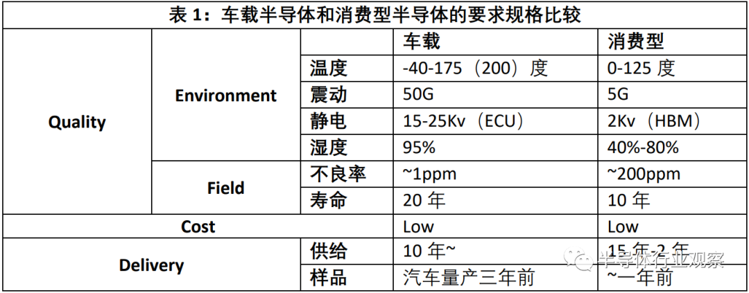 下表1是车载半导体与用于一般数码家电等消费电子产品的半导体的要求规格的比较表。即,此表虽出自2008年9月1日电装发布的《第五届信赖性论坛》(主办:日经Micro Device),即使在今天也不过时。