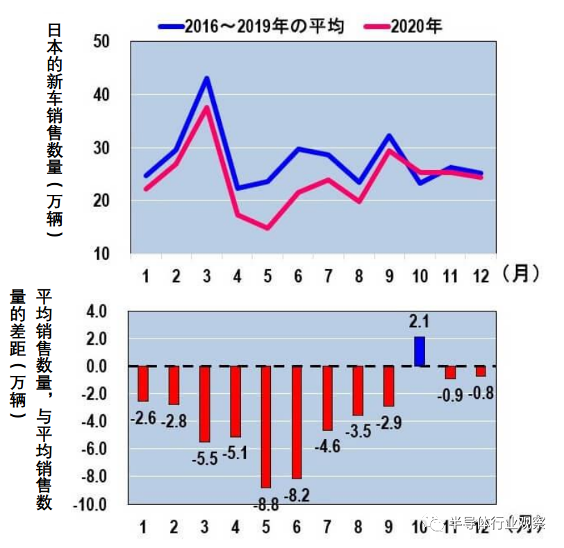 此处,比较2016年-2019年每月新车平均销售数量(以下简称为:平均数量)与2020年的销售数量后,得出下图4的上半部分。此外,且笔者将二者的差(即2020年每月的平均销售数量到底下滑至何种程度)制成了下图4的下半部分。