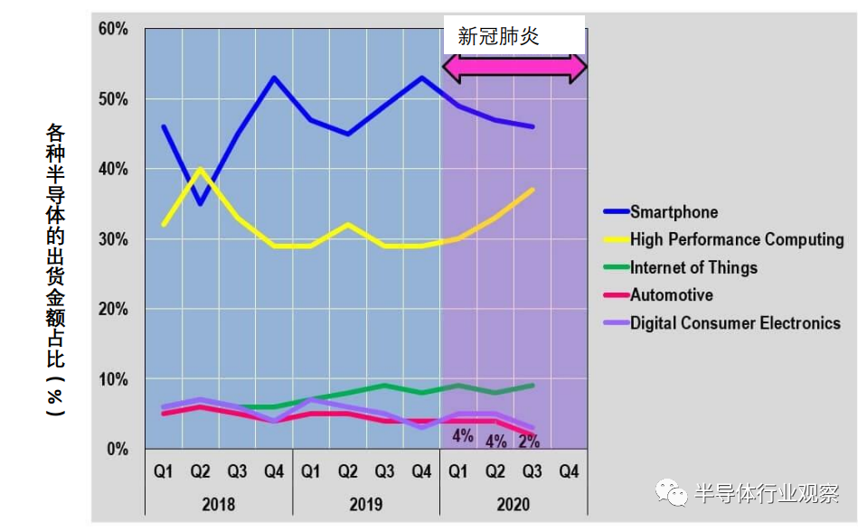 此外,从上图可知,进入2020年,High Performance Computing的占比大幅度提升。主要原因在于,新冠肺炎引起全球范围内远程办公的普及,且人们不得已宅在家中,导致网购大幅度发展、高性能游戏机畅销。比方说,随着远程办公的普及,PC需求扩大,推动了美国的处理器厂家AMD(将委托给TSMC代工)的业务扩大。此外,由于全球范围内通信数据的大幅度增长,亚马逊、微软、谷歌等云服务企业也开始踊跃建设数据中心,他们的数据中心都需要大量的服务器,这些服务器又都需要搭载高性能的处理器。因此,High Performance Computing的占比大幅度提升。