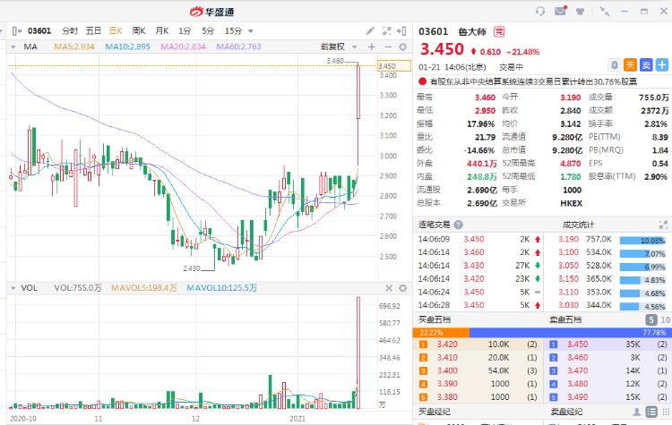 鲁大师(3601.HK)快速拉升至21.48%,报3.45港元,创逾4个月新高价,成交额放大至2372万港元,总市值9.28亿港元。