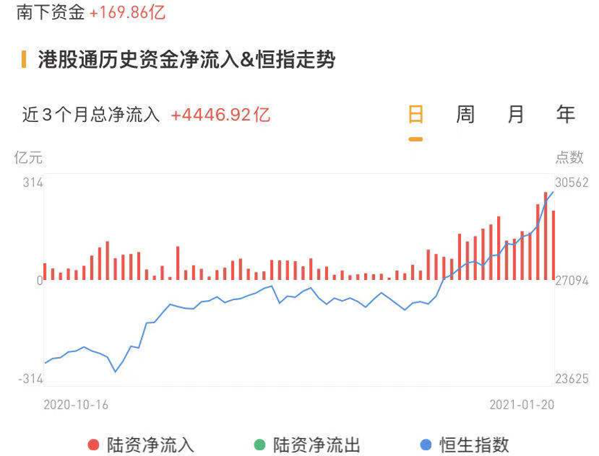 南下资金今日净流入港股高达169.86亿港元,流入规模环比减少超35亿港元,但仍维持流入高位。