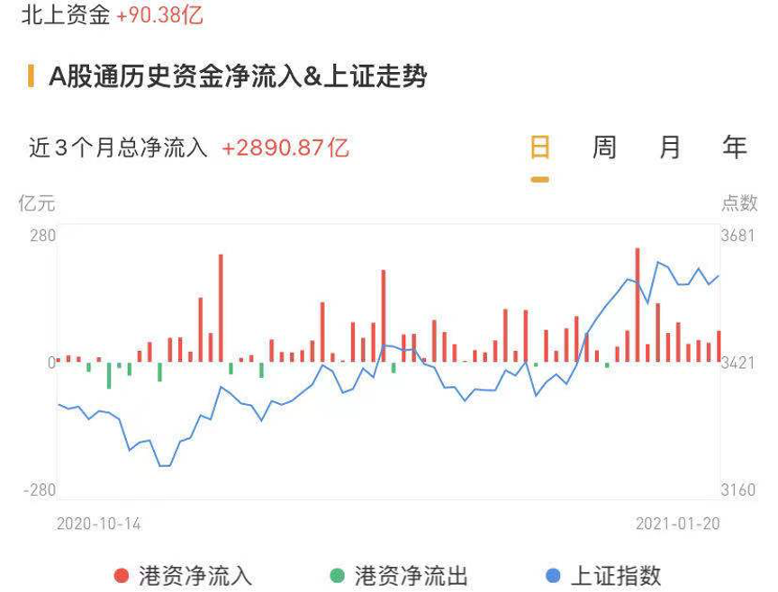 北上资金今日净流入90.38亿元,流入规模较前一交易日继续增加约30亿元。