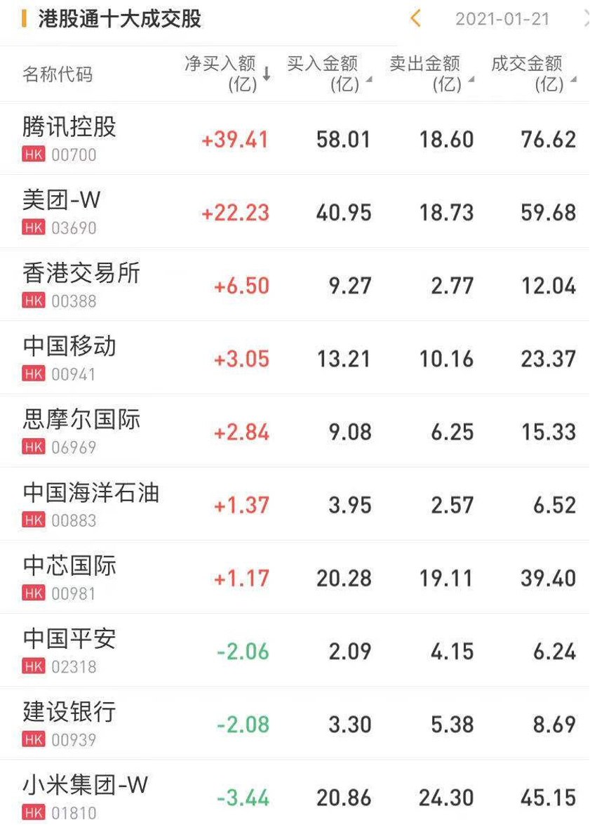 个股方面,今日南下资金净买入腾讯控股39.41亿港元,连续多日为买入之最。此外,南下资金净买入美团-W22.23亿港元,净买入香港交易所6.50亿港元。