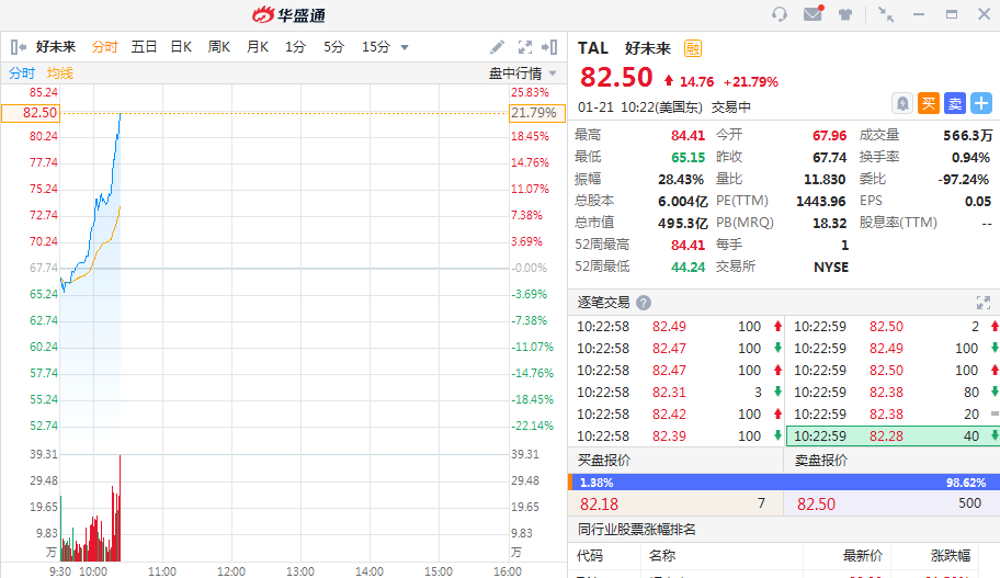 华盛资讯1月21日消息,美股盘中,好未来股价迅速走高,截至发稿,涨幅扩大至21.79%,股价最高触及84.43美元,刷新历史新高。该公司今日发布超预期财报。