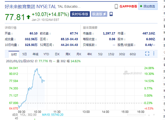 好未来当前涨16.6%,报79.00美元,市值474.13亿美元。