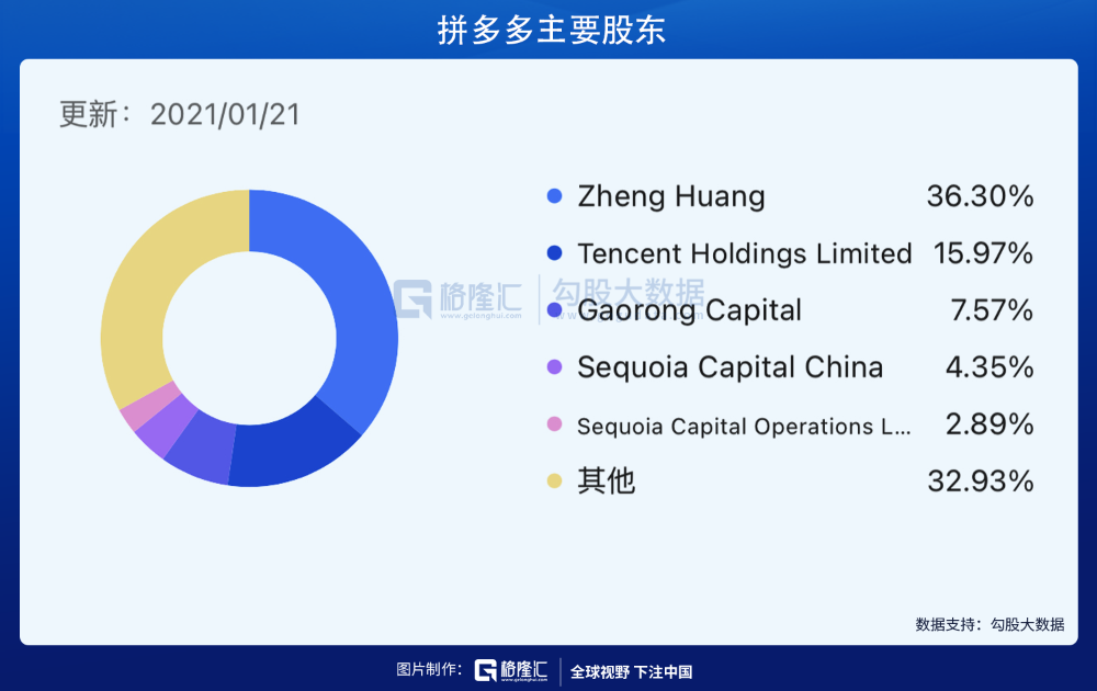从2016年开始,腾讯的身影出现在拼多多的每一轮融资之中,累计持股16%,是除了创始人黄征(持股36.3%)之外的第一大股东。从上市到今日,拼多多的股价涨了6倍不止,腾讯对其的投资也因此大赚。