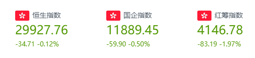 周四,恒生指数跌34.71点或0.12%,报29927.76点,全日成交额达2649.05亿。国企指数跌0.5%,报11889.45点,红筹指数跌1.97%,报4146.78点。