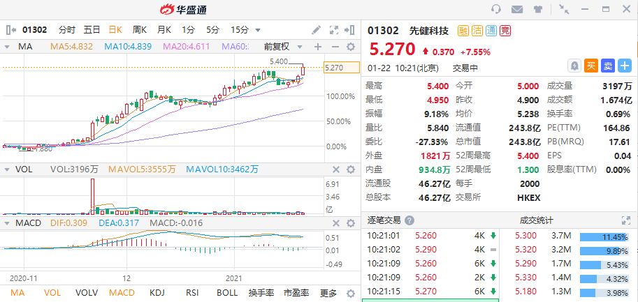 华盛资讯1月22日消息,先健科技今日高开高走,一度涨超7%,突破历史新高。截至发稿,先健科技涨7.55%,现报5.27港元,成交额达1.674亿,当前总市值为243.8亿港元。
