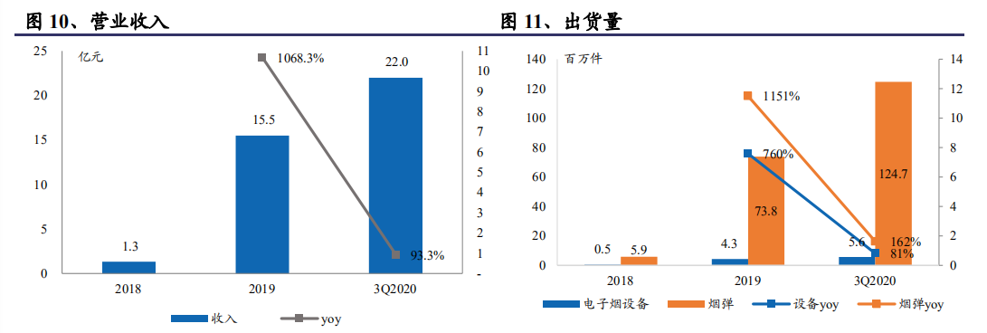 公司主要销售电子烟设备和烟弹,截至 2020 年 9 月 30 日,电子烟设备和烟弹出货量分别达到 560 万件、1.25 亿件,同比增长 81%、162%。