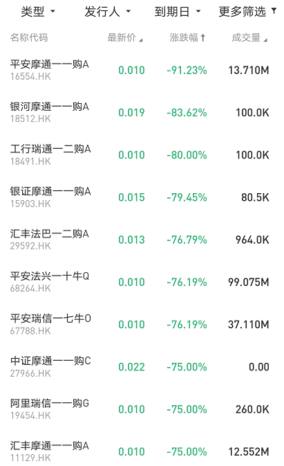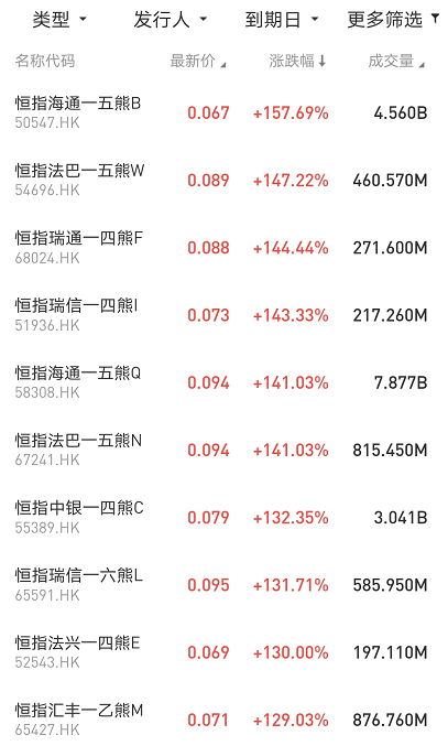 恒指海通一五熊B(50547)涨157.69%占据涨幅榜第一。其次是恒指法巴一五熊W(54696)涨147.22%、恒指瑞通一四熊F(68024)涨144.44%。