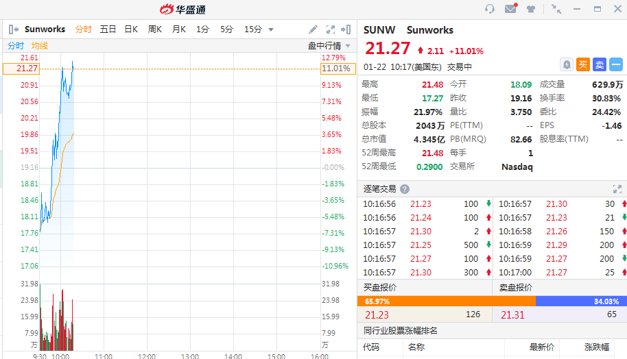 华盛资讯1月22日消息,美股盘初,部分光伏太阳能板块股大涨,截至发稿,Sunworks(SUNW)涨超11%,昱辉阳光(SOL)涨近5%。
