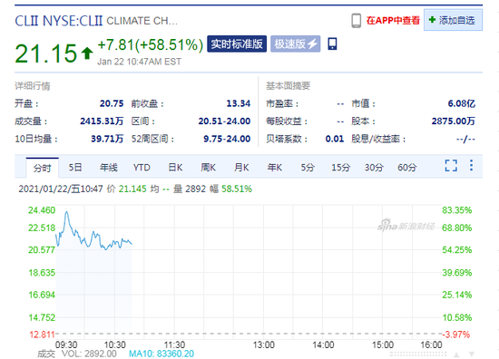 特殊目的收购公司Climate Change Crisis早盘大涨58.51%。据悉美国充电站企业EVgo将与该公司合并上市,交易最早于今日完成。