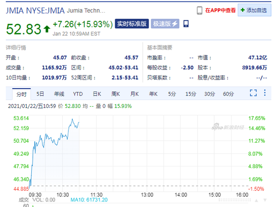 周五早盘,Jumia大涨15.9%,报52.83美元,创历史新高。