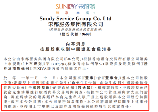 1月23日消息,1月22日晚间,宋都服务发布公告,公司董事局主席俞昀的父亲俞建平(公司控股股东)收到证监会通知书。根据该通知,中国证监会已就俞先生涉嫌进行股票内幕交易展开调查。根据公司管理层与俞先生的讨论,调查所涉及的证券账户为俞先生私人账户且上述股票与公司股份无关连。截至本公告日期,公司业务如常运作。控股股东收到中国证监会通知书