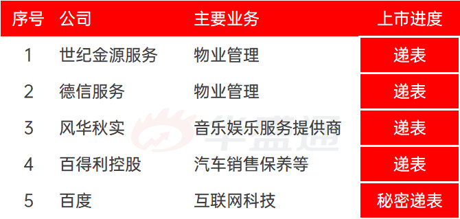 本周有5家公司递交上市申请 ,包括百度秘密递表二次上市,还有2家物业公司,年初至今,物管股疯狂的上市潮还在持续。