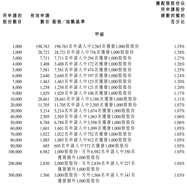 因此,香港公开发售项下发售股份的最终数目为1.25亿股发售股份,相当于全球发售项下初步可供认购的发售股份总数50%。香港公开发售项下有39,798名获接纳申请人获分配香港发售股份。