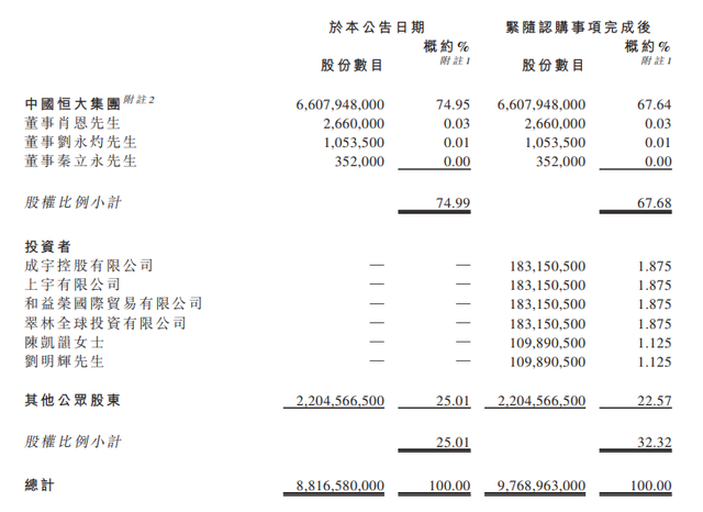 此外,公告还称,本次增发对象包括成宇控股(50亿港元)、上宇有限公司(50亿港元)、和益荣国际贸易(50亿港元)、翠林全球投资(50亿港元)、陈凯韵女士(30亿港元)和刘明辉先生(30亿港元)。