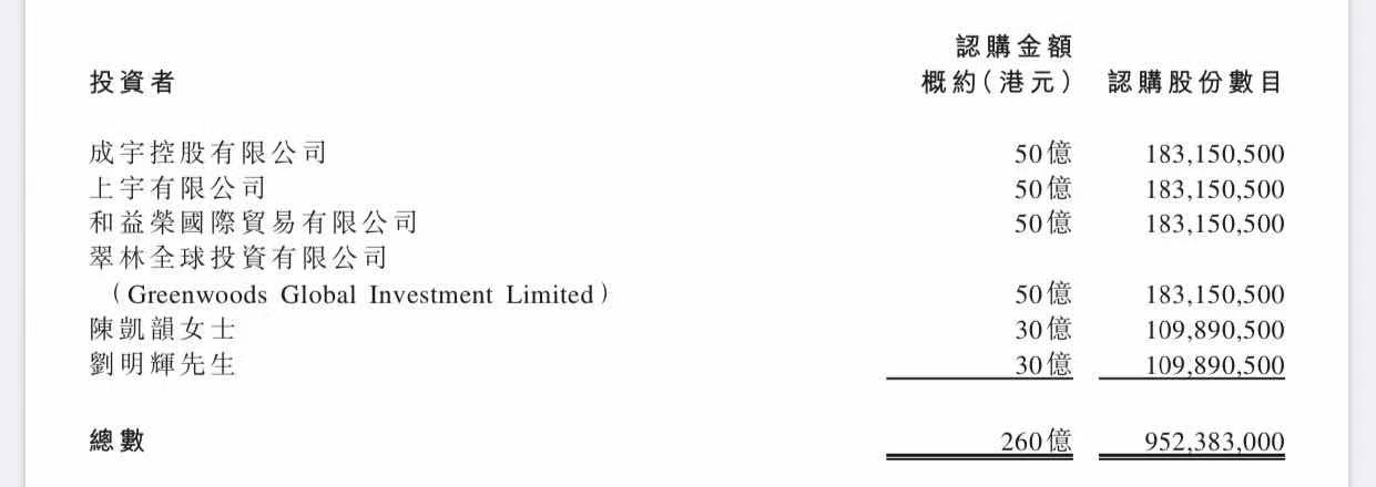 公告显示,华人置业创始人刘銮雄的妻子陈凯韵出资30亿港元,持有109890500股股份。