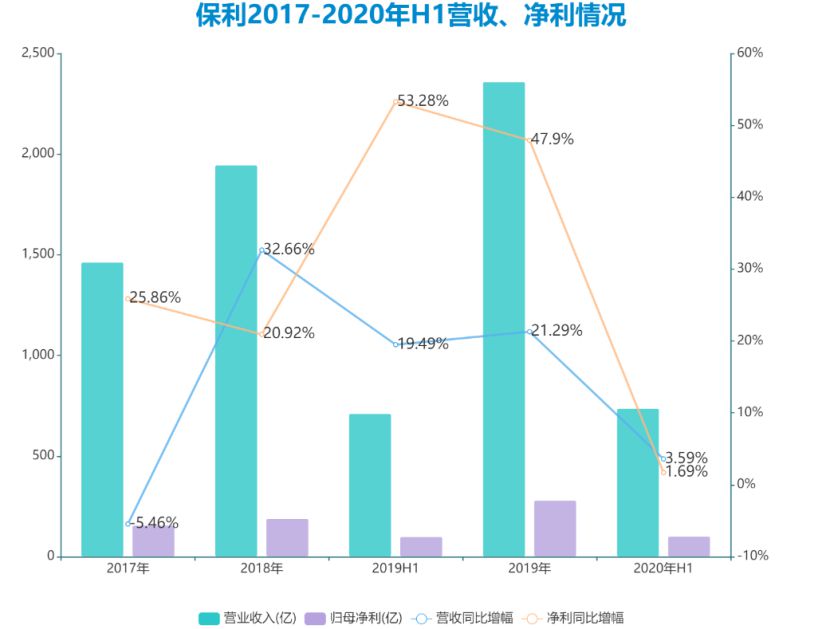这也相应影响了营业收入及利润的结转,相比过去几年,2020年上半年保利实现营业总收入737.06亿元,同比增长3.59%;净利润133.22亿元,同比增长2.8%;归母净利润101.24亿元,同比增长仅1.7%,而上一年这一指标为53.28%。