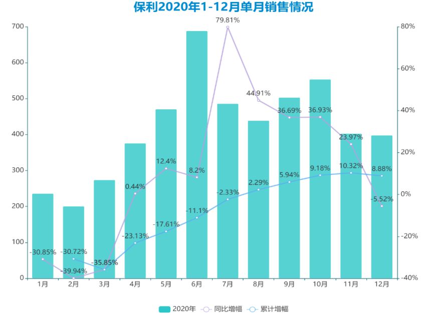 随着防疫的进展、市场的复苏,4月起保利单月销售同比回正,维持在400亿元以上,6月达到全年最高单月销售688.53亿元。