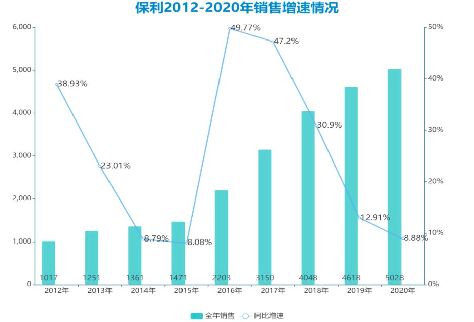 最终到年底,保利发展录得2020年全年销售5028.48亿元,同比增长8.88%——这也是2016年以来的最低增速。