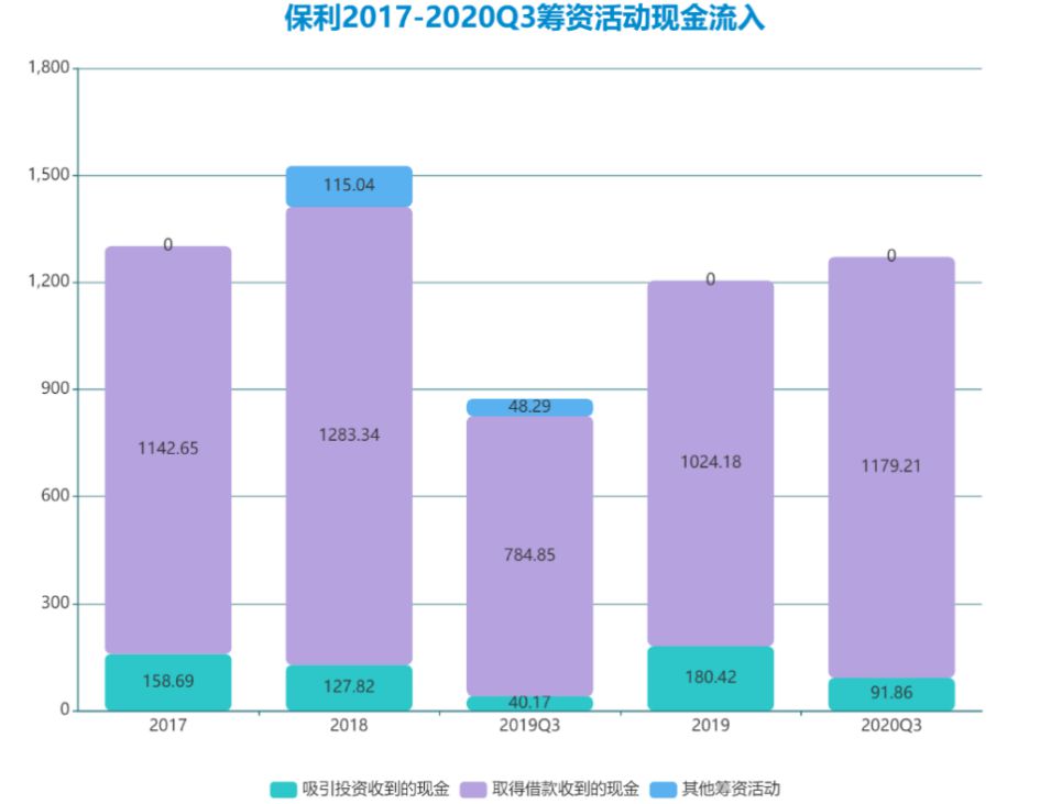 拿地自然要资金,同时也可窥见保利2020年筹资活动现金流入量直线上涨。