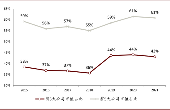 港股必选消费行业呈现市值头部集中趋势明显特点。板块标的存较多国民性品牌消费品公司,如农夫山泉、华润啤酒等,大市值公司占比大。近5年市值因子依然显著,大市值公司市值占比进一步提升。以70亿美元/20亿美元为界划分大、中、小市值公司,大市值公司市值占比由2015的59%提升至2021年88%(2021年大市值公司一共11家);前3/5大公司市值占比亦由2015年38%/59%提升至2021年43%/61%,呈现出较明显的市值集中趋势,考虑部分行业强者恒强特点,我们预计该趋势有望持续。