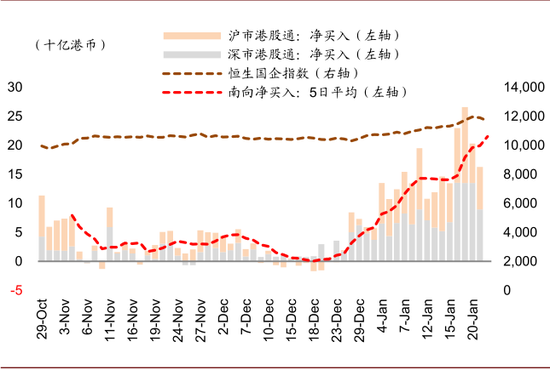 资料来源:万得资讯,中金公司研究部;注:各板块流入情况为我们根据港股通持股数与股价均价测算所得,数据截至2021年1月22日