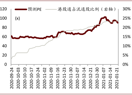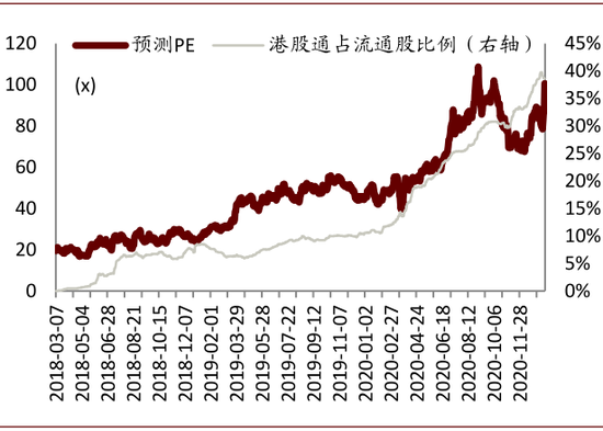 总体而言,对于港股通持股比例较高的个股,估值也高于板块平均估值水平,我们认为主导因素仍为公司基本面,但南下资金的定价权亦较为明显,例如颐海国际与农夫山泉,伴随港股通持股占比持续提升,其估值亦在逐渐提升。