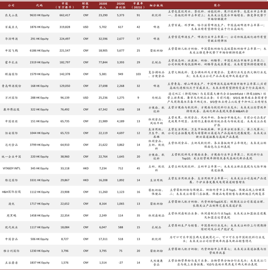 资料来源:公司公告,万得资讯,彭博资讯,中金公司研究部;注:1)统一企业中国、康师傅控股、中国食品、恒安国际、H&H国际控股、周黑鸭、颐海国际、农夫山泉、维达国际收入与利润预期来自中金预测,其余来自彭博一致预期;2)除我们覆盖的五谷磨房外,其余均纳入港股通;3)数据截至2021年1月22日