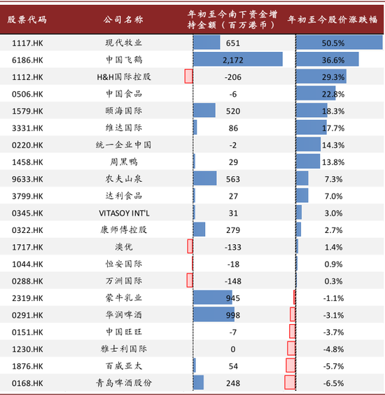 南下资金增持,股价表现略有分化。中金日常消费板块中,伴随南下资金增持,部分公司股价年初至今实现较好收益,如中国飞鹤、颐海国际、农夫山泉等。但部分公司股价仍面临小幅回调,包括华润啤酒、青岛啤酒股份,我们判断可能由于QDII资金与外资减持导致。此外,其他部分公司股价取得较高收益率,如H&H国际控股、中国食品、维达国际、统一企业中国、周黑鸭、达利食品等,我们预计主要由QDII资金与外资增持所致。