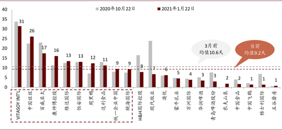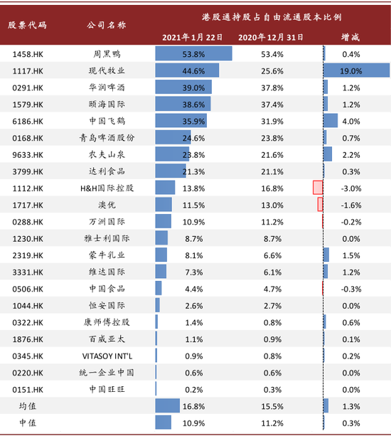 资料来源:公司公告,万得资讯,中金公司研究部;注:农夫山泉港股通持股占自由流通股本比例计算中,我们采用公众股东股本作为自由流通股本数据;截至2021年1月22日