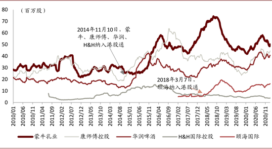 港股通开通后流动性问题有所缓解。港股通开通后资金南下便捷性提高,一定程度上缓解港股流动性问题,例如蒙牛乳业、康师傅控股、华润啤酒、H&H国际控股和颐海国际自纳入港股通后,成交量较此前明显提升。我们预计随内地资金投资范围进一步扩大及中国公司对外资吸引力进一步上升,港股必选消费板块的流动性未来具备上升空间。
