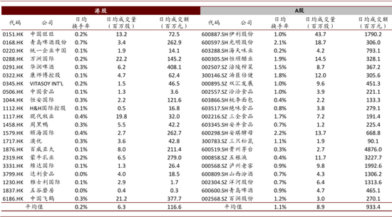 港股整体流动性相比A股较低。由于港股自身投资环境及港股、A股市场机构化程度不同,港股换手率相对受限。以2020年12月计,港股必选消费板块日均换手率仅为0.2%,低于相比A股的1.1%水平,通过日均成交额数据我们亦发现港股标的显著低于A股,因此交易层面上相对A股更可能导致一定溢价和折价。