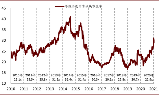港股必选消费板块当前交易在30倍预测市盈率,较2020年22.9倍、过去三年平均22.1倍均有提升。疫情过后市场对必选消费各公司业绩表现稳定性的认可度提升,我们判断随2021年板块基本面回升,板块估值或有提升机会,但估值分化或将长期存在。