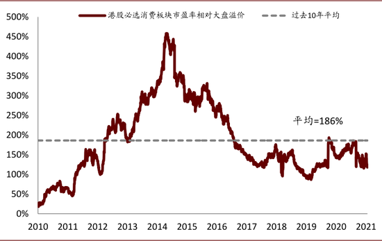 图表: 港股必选消费板块市盈率相对恒生国企指数估值溢价